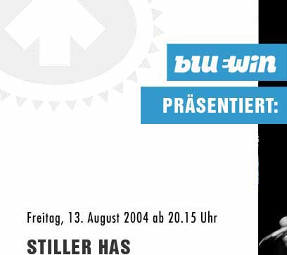 Stiller Has sind mit den 2 Topmusikern Balz Nil und Schifer Schafer und der brillianten <Bühnensau> Endo Anaconda seit 15 Jahren ein Garant für Inhalt und Qualität auf Schweizer Bühnen, räumen ab wie niemand sonst und werden nie langweilig... Stiller Has wird die Ehre zuteil, das Musikfestival <Im Fluss 04> in Thun zu eröffnen, und sie werden damit Heerscharen von Musikfreunden und –freundinnen glücklich machen, denn im Kanton Bern sind Stiller Has seit eh und je Kult, weil: ...Bärn hett dr Rock u Thun hett dr Blues.... und ....göht doch o chli däre grüene Aare nah, vo Thun uf Bärn u vo Bärn uf Thun.....